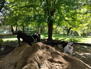 With over 8 acres, the vegetation and structures offer both visual, and sound barriers giving the dogs the choice of finding playmates or exploring on their own.